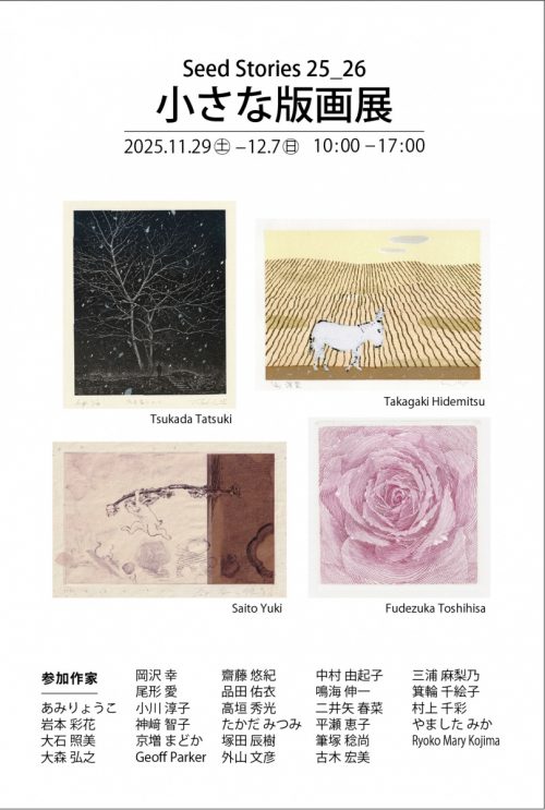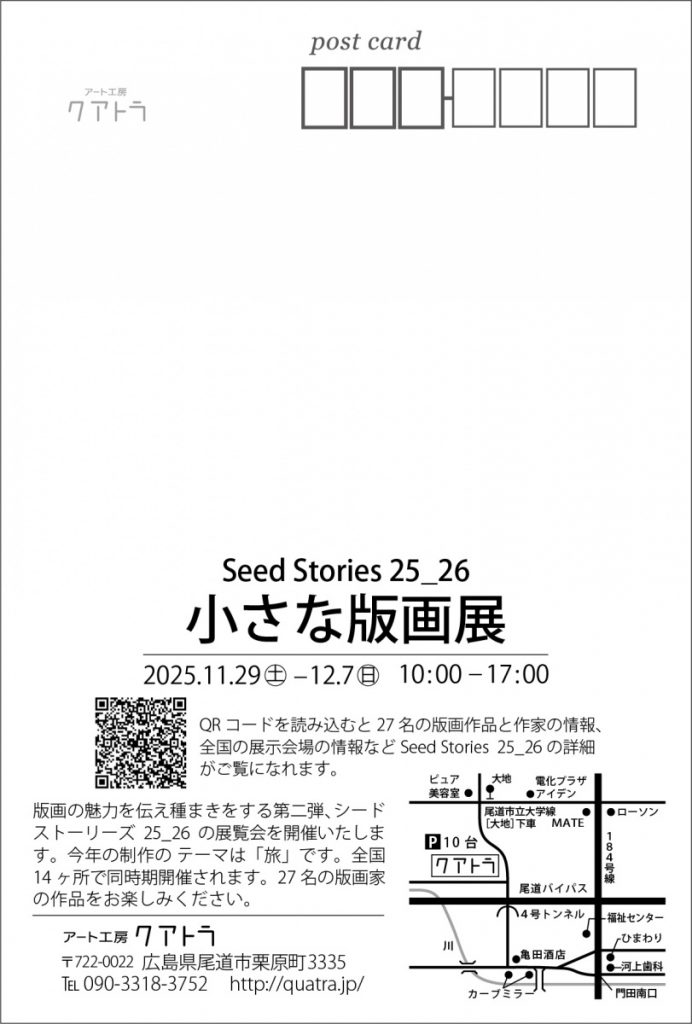 小さな版画展2025 2025.11.29(土)〜12.7(日)10:00〜17:00 アート工房クアトラ 〒722-0022 広島県尾道市栗原町3335 今年も充実した版画展になります。 「小さな版画展」版の種類も多く、バライティに富んだ版画の作品を見ることができます。 ぜひ、ゆっくりみて楽しんでください。 展覧会 展示 posted: 2025年11月22日