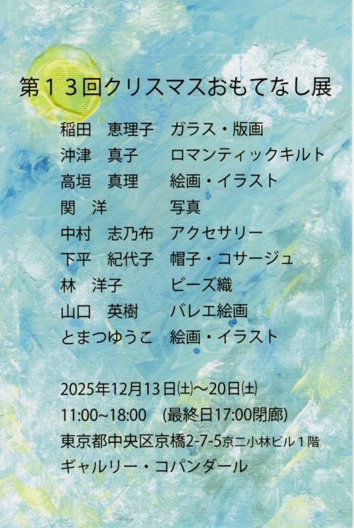 13回目になりました。クリスマスや新年のためのクリスマスマーケット的なグループ展です。